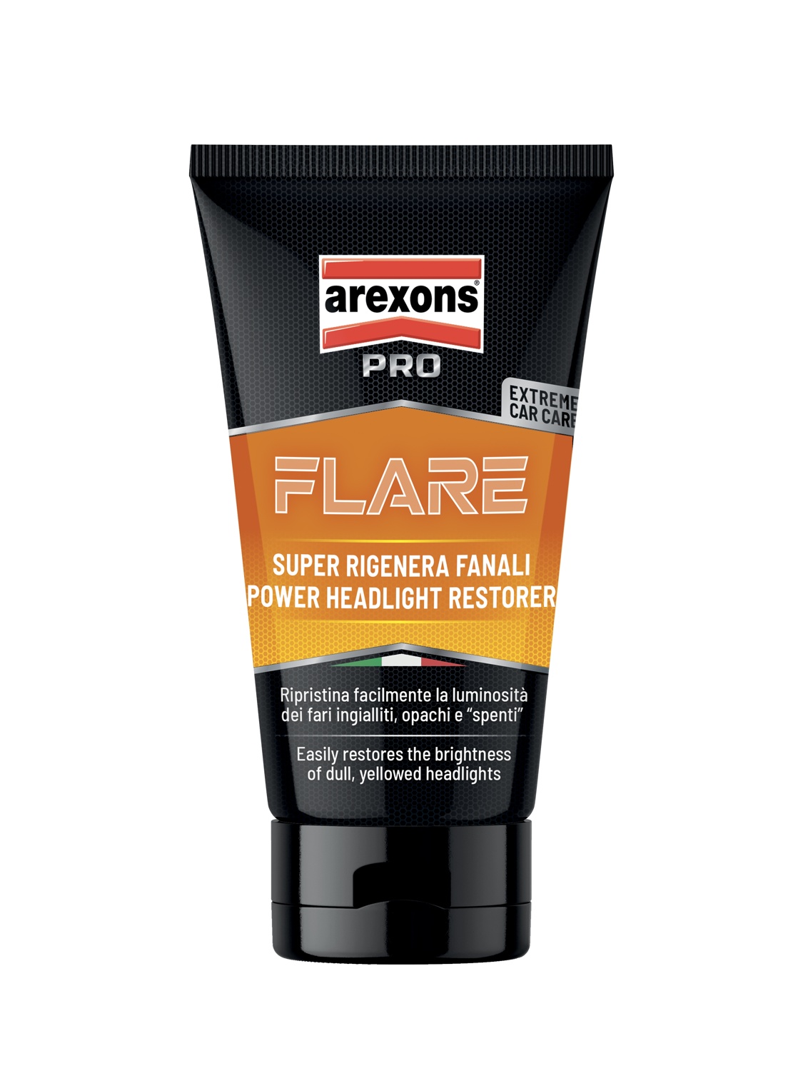 FLARE, pasta do ręcznego przywracania przezroczystości reflektorów na wczesnych etapach matowienia. Usuwa zmatowienie powierzchni plastikowych reflektorów. Poprawia jasność reflektorów podczas jazdy nocą. Nadaje się również do polerowania owiewek i szyb motocykli i skuterów.